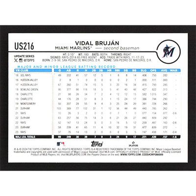 This is a 2024 Topps Update Vidal Brujan baseball card. The card is #US216 and pictures show condition.