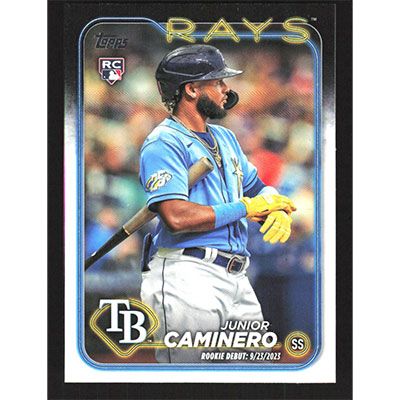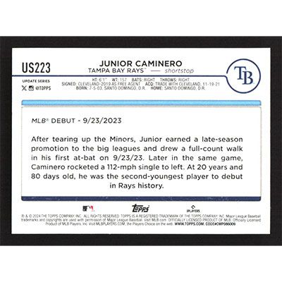This is a 2024 Topps Update Junior Caminero Rookie Debut baseball card. The card is #US223 and pictures show condition. Team(s): Tampa Bay Rays Rookie Card (RC)