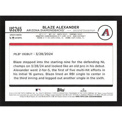 This is a 2024 Topps Update Blaze Alexander Rookie Debut baseball card. The card is #US265 and pictures show condition. Team(s): Arizona Diamondbacks Rookie Card (RC)
