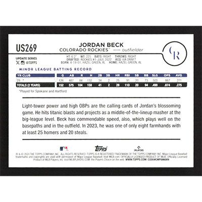 This is a 2024 Topps Update Jordan Beck baseball card. The card is #US269 and pictures show condition.