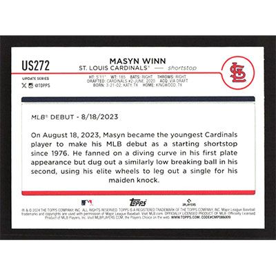 This is a 2024 Topps Update Masyn Winn Rookie Debut baseball card. The card is #US272 and pictures show condition. Team(s): St. Louis Cardinals Rookie Card (RC)