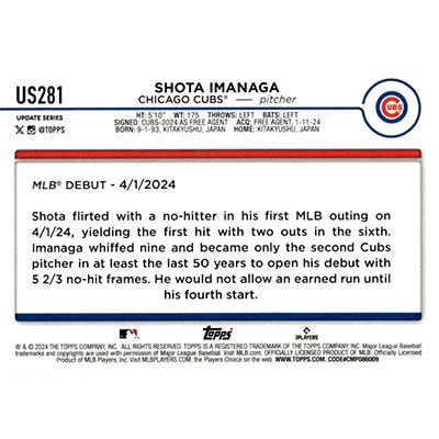 This is a 2024 Topps Update Shota Imanaga Rookie Debut baseball card. The card is #US281 and pictures show condition. Team(s): Chicago Cubs Rookie Card (RC)