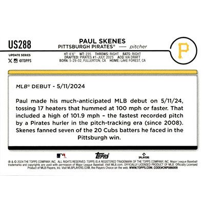 This is a 2024 Topps Update Paul Skenes Rookie Debut baseball card. The card is #US288 and pictures show condition. Team(s): Pittsburgh Pirates Rookie Card (RC)