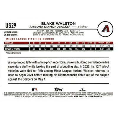 This is a 2024 Topps Update Blake Walston baseball card. The card is #US29 and pictures show condition. Team(s): Arizona Diamondbacks Rookie Card (RC)