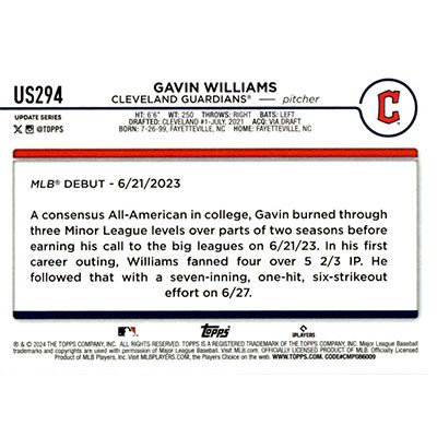 This is a 2024 Topps Update Gavin Williams Rookie Debut baseball card. The card is #US294 and pictures show condition. Team(s): Cleveland Guardians Rookie Card (RC)