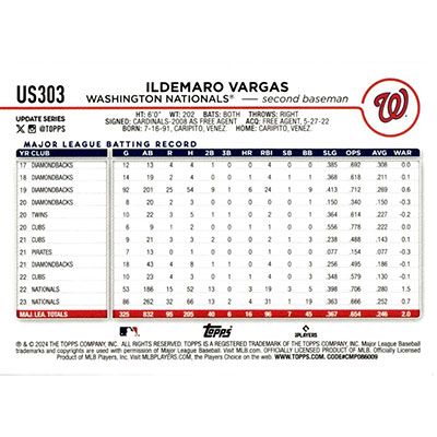 This is a 2024 Topps Update Ildemaro Vargas baseball card. The card is #US303 and pictures show condition.