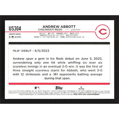 This is a 2024 Topps Update Andrew Abbott Rookie Debut baseball card. The card is #US304 and pictures show condition. Team(s): Cincinnati Reds Rookie Card (RC)