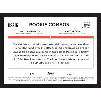 This is a 2024 Topps Update David Banuelos and Matt Krook Rookie Combos baseball card. The card is #US315 and pictures show condition. Team(s): Baltimore Orioles Rookie Card (RC)