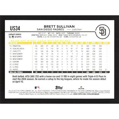 This is a 2024 Topps Update Brett Sullivan baseball card. The card is #US34 and pictures show condition.