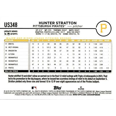 This is a 2024 Topps Update Hunter Stratton baseball card. The card is #US348 and pictures show condition. Team(s): Pittsburgh Pirates Rookie Card (RC)