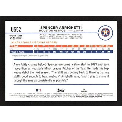 This is a 2024 Topps Update Spencer Arrighetti baseball card. The card is #US52 and pictures show condition. Team(s): Houston Astros Rookie Card (RC)