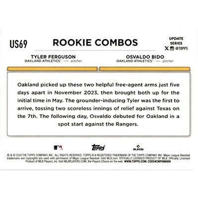 This is a 2024 Topps Update Tyler Ferguson and Osvaldo Bido Rookie Combos baseball card. The card is #US69 and pictures show condition. Team(s): Oakland Athletics Rookie Card (RC)