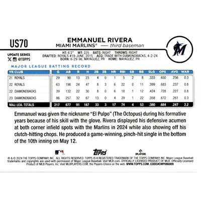 This is a 2024 Topps Update Emmanuel Rivera baseball card. The card is #US70 and pictures show condition.