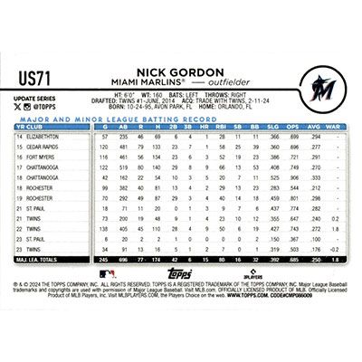 This is a 2024 Topps Update Nick Gordon baseball card. The card is #US71 and pictures show condition.