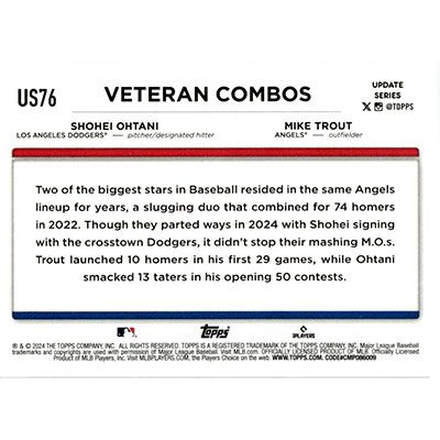 This is a 2024 Topps Update Shohei Ohtani and Mike Trout Veteran Combos How You Been baseball card. The card is #US76 and pictures show condition. Team(s): Los Angeles Dodgers