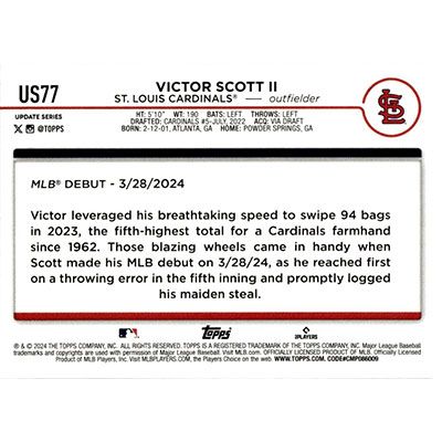 This is a 2024 Topps Update Victor Scott II Rookie Debut baseball card. The card is #US77 and pictures show condition. Team(s): St. Louis Cardinals Rookie Card (RC)
