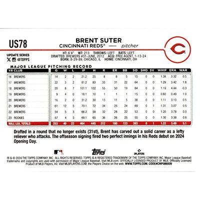 This is a 2024 Topps Update Brent Suter baseball card. The card is #US78 and pictures show condition.