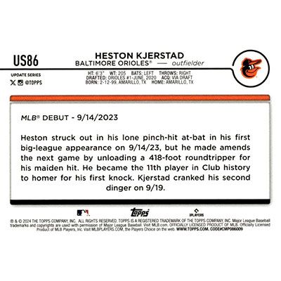 This is a 2024 Topps Update Heston Kjerstad Rookie Debut baseball card. The card is #US86 and pictures show condition. Team(s): Baltimore Orioles Rookie Card (RC)