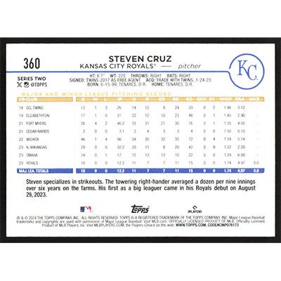 This is a 2024 Topps Yellow Steven Cruz baseball card. The card is #360 and pictures show condition.