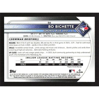 This is a 2025 Bowman Chrome Bo Bichette baseball card. The card is #56 and pictures show condition.