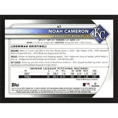 This is a 2025 Bowman Chrome Noah Cameron baseball card. The card is #67 and pictures show condition.
