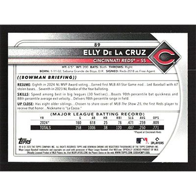 This is a 2025 Bowman Chrome Elly De La Cruz baseball card. The card is #89 and pictures show condition.