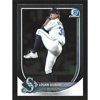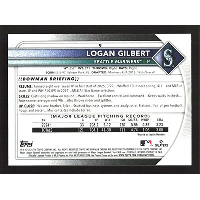 This is a 2025 Bowman Chrome Logan Gilbert baseball card. The card is #9 and pictures show condition.