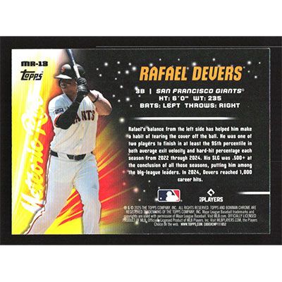 This is a 2025 Bowman Chrome Mega Box Meteoric Rise Rafael Devers baseball card. The card is #MR-13 and pictures show condition. Team(s): San Francisco Giants