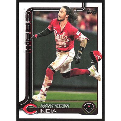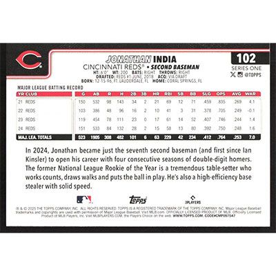 This is a 2025 Topps Jonathan India baseball card. The card is #102 and pictures show condition.