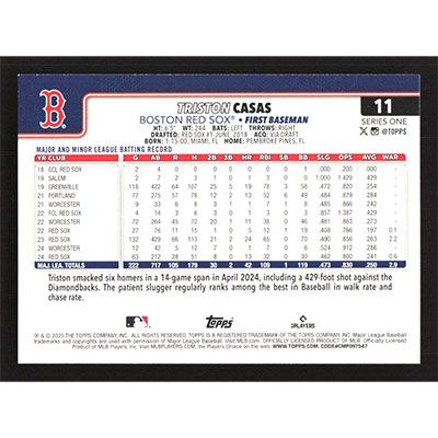 This is a 2025 Topps Triston Casas baseball card. The card is #11 and pictures show condition.