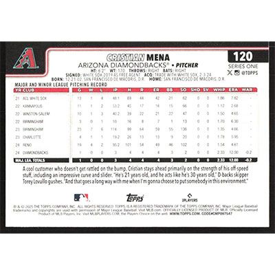 This is a 2025 Topps Cristian Mena baseball card. The card is #120 and pictures show condition.