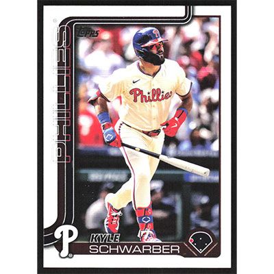 This is a 2025 Topps Kyle Schwarber baseball card. The card is #141 and pictures show condition.