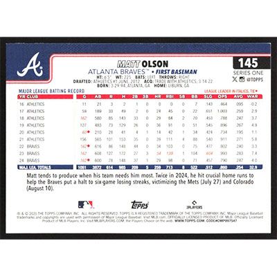This is a 2025 Topps Matt Olson baseball card. The card is #145 and pictures show condition.