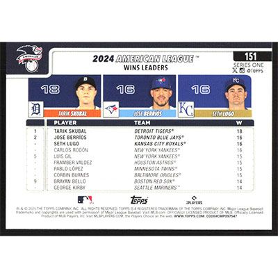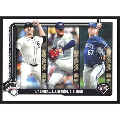 This is a 2025 Topps Tarik Skubal, Jose Berrios and Seth Lugo League Leaders baseball card. The card is #151 and pictures show condition. Team(s): Detroit Tigers/Toronto Blue Jays/Kansas City Royals