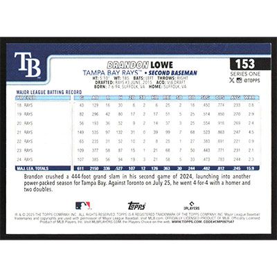 This is a 2025 Topps Brandon Lowe baseball card. The card is #153 and pictures show condition.