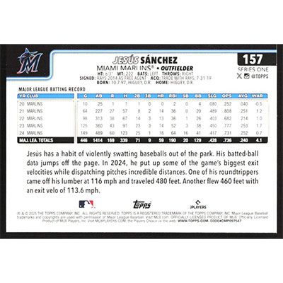 This is a 2025 Topps Jesus Sanchez baseball card. The card is #157 and pictures show condition.
