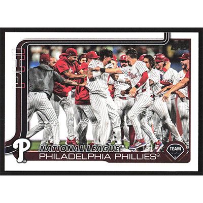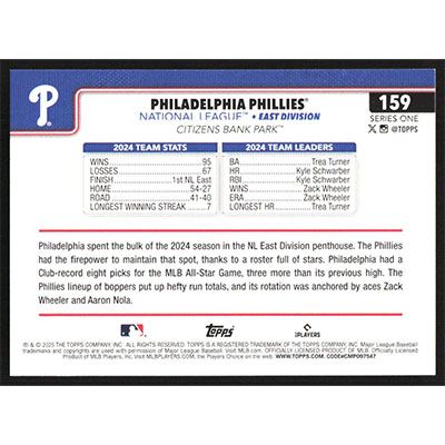 This is a 2025 Topps Philadelphia Phillies Team Card baseball card. The card is #159 and pictures show condition.