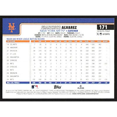This is a 2025 Topps Francisco Alvarez baseball card. The card is #171 and pictures show condition.