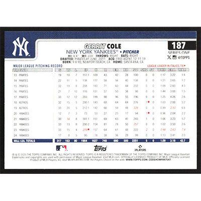 This is a 2025 Topps Gerrit Cole baseball card. The card is #187 and pictures show condition.