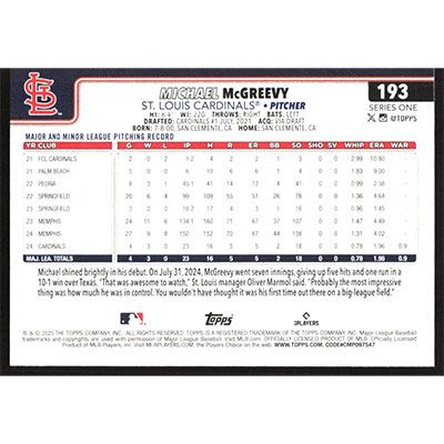 This is a 2025 Topps Michael McGreevy baseball card. The card is #193 and pictures show condition.
