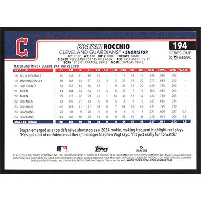 This is a 2025 Topps Brayan Rocchio baseball card. The card is #194 and pictures show condition.