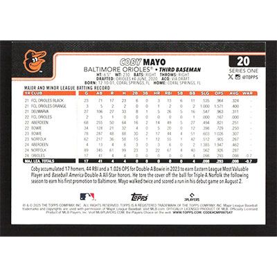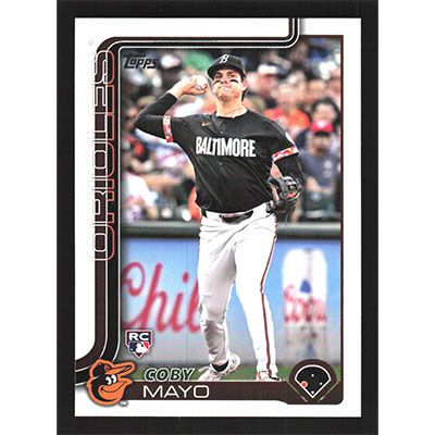 This is a 2025 Topps Coby Mayo baseball card. The card is #20 and pictures show condition.