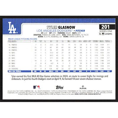 This is a 2025 Topps Tyler Glasnow baseball card. The card is #201 and pictures show condition.