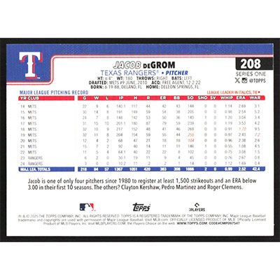 This is a 2025 Topps Jacob deGrom baseball card. The card is #208 and pictures show condition.