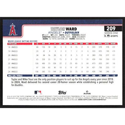 This is a 2025 Topps Taylor Ward baseball card. The card is #209 and pictures show condition.
