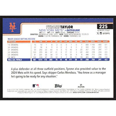 This is a 2025 Topps Tyrone Taylor baseball card. The card is #225 and pictures show condition.