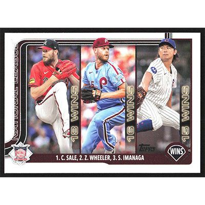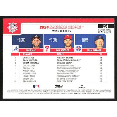 This is a 2025 Topps Chris Sale, Zack Wheeler and Shota Imanaga League Leaders baseball card. The card is #234 and pictures show condition. Team(s): Atlanta Braves/Philadelphia Phillies/Chicago Cubs
