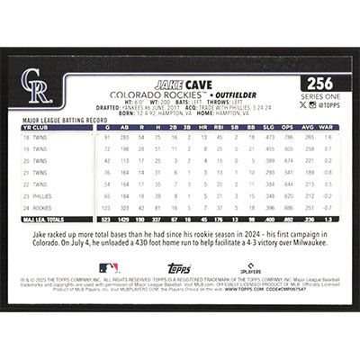 This is a 2025 Topps Jake Cave baseball card. The card is #256 and pictures show condition.