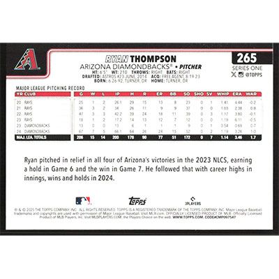 This is a 2025 Topps Ryan Thompson baseball card. The card is #265 and pictures show condition.