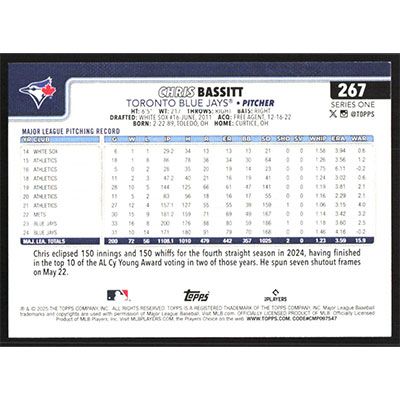 This is a 2025 Topps Chris Bassitt baseball card. The card is #267 and pictures show condition.